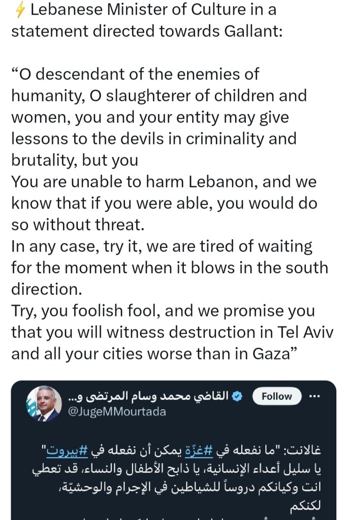 πŸ”₯ LEBANON’S MINISTER OF CULTURE SENDS THIS STARK RESPONSE TO THE THREATS FROM ISRAEL’S GALLANT, ‘SLAUGHTERER OF CHILDREN AND WOMEN’ πŸ”₯ STOP THE GENOCIDE IN GAZA πŸ‘¦ πŸ‘¨β€πŸ‘¦ πŸ‘§ πŸ‘Ά πŸ‡±πŸ‡§ ✌️ πŸ‡΅πŸ‡Έ