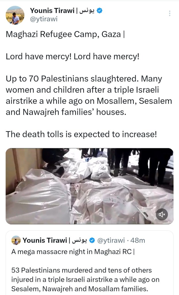 πŸ”₯ DAY 79 πŸ”₯ TRIPLE US – ISRAELI AIRSTRIKE ON HOMES OF THREE FAMILES IN MAGHAZI REFUGEE CAMP, GAZA, HAS KILLED 70+ βœ‹οΈ