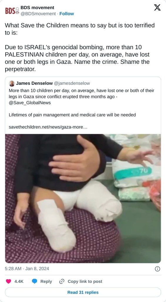 👶 MORE THAN TEN PALESTINIAN CHILDREN HAVE LOST LEG(S) EVERY DAY OF ISRAEL’S US BACKED GENOCIDAL BOMBING OF GAZA 👦 👧 👨‍👧 👨‍👩‍👧‍👦 ✋️