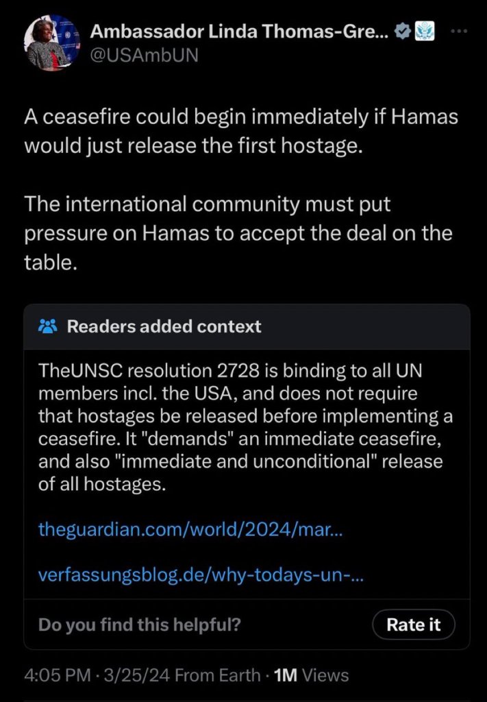 🔥 DAY 173 🔥 UNSC RESOLUTION 2728 ‘DEMANDS’ IMMEDIATE CEASEFIRE .. X’S COMMUNITY NOTES CORRECT THE US AMBASSADOR ⚖️ 🇵🇸 ✌️ 🇵🇸