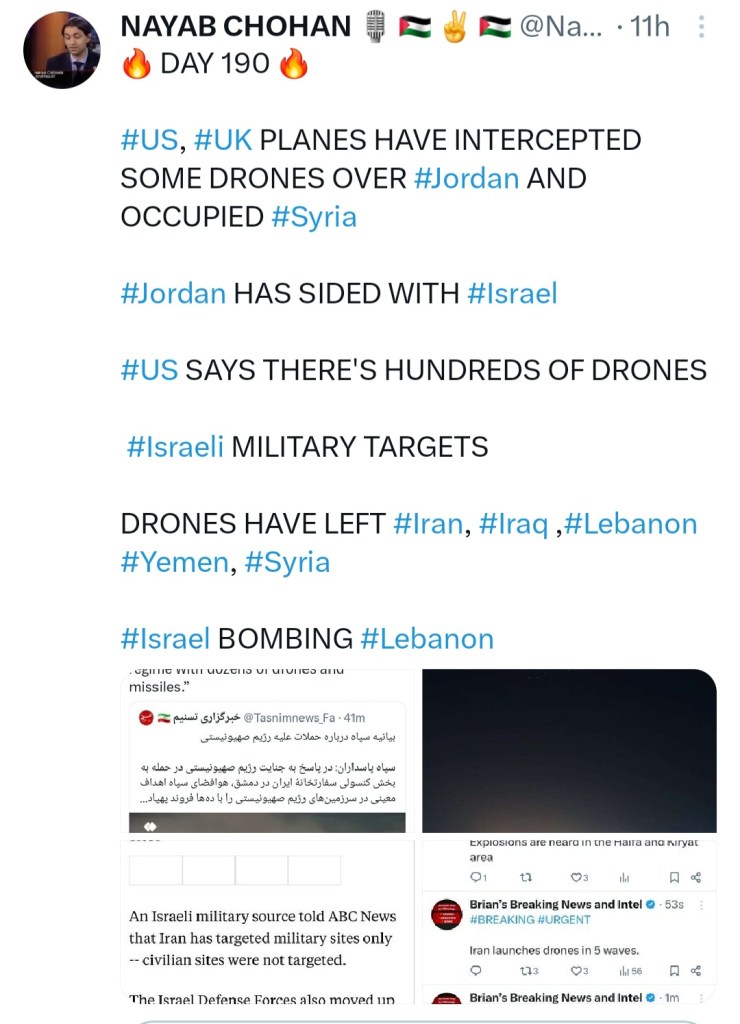 🔥 DAY 191 🔥 IRAN LAUNCHED LARGEST DRONE STRIKE IN HISTORY LAST NIGHT TO PUNISH ISRAEL FOR ATTACK ON IT’S SYRIAN CONSULATE  🇮🇷 ✌️ 🇵🇸