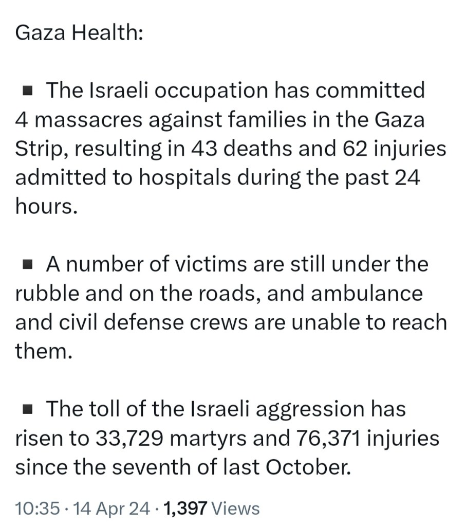 Previous Post🔥 DAY 187 🔥 ISRAEL ASSASSINATES THREE SONS AND THREE GRANDCHILDREN OF ISMAIL HANIYEH, HEAD OF HAMAS POLITICAL BUREAU 🇵🇸 ✌️ 🇵🇸 Next Post🔥 DAY 192 🔥 ISRAEL HAS BEEN BOMBING NUSEIRAT REFUGEE CAMP IN CENTRAL GAZA FOR 4 DAYS 🇵🇸 ✌️ 🇵🇸