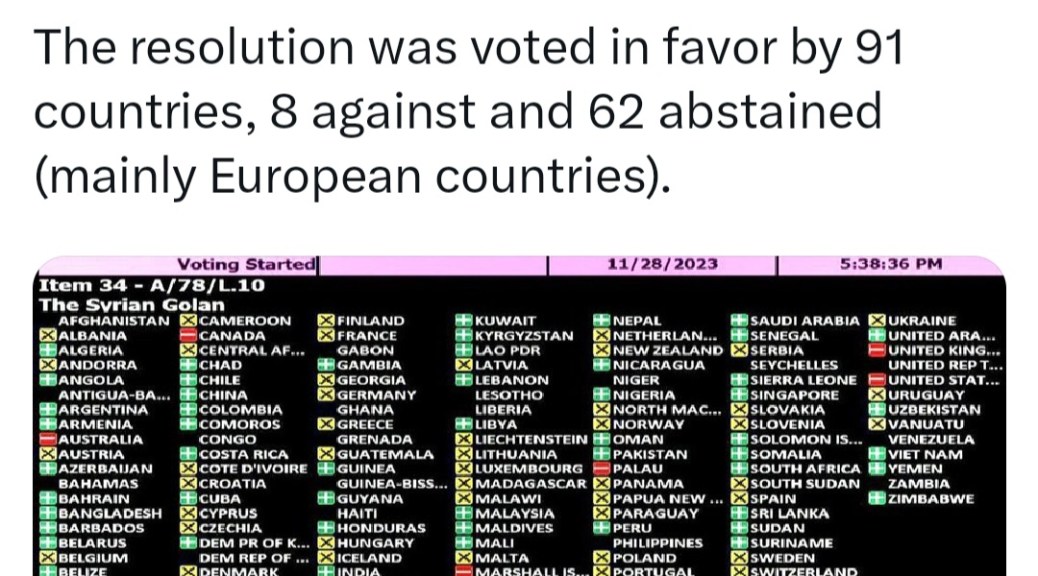 πŸ‡΅πŸ‡Έ UN ASSEMBLY CALLS ON ISRAEL TO WITHDRAW FROM ALL OCCUPIED TERRITORIES AND SYRIAN GOLAN HEIGHTS, AND RETURN TO PRE 67 BORDERS 91 VOTED IN FAVOUR , WHILST 8 (INCLUDING US, UK, ISRAEL) VOTED AGAINST AND 62 ABSTAINED πŸ‡΅πŸ‡Έ