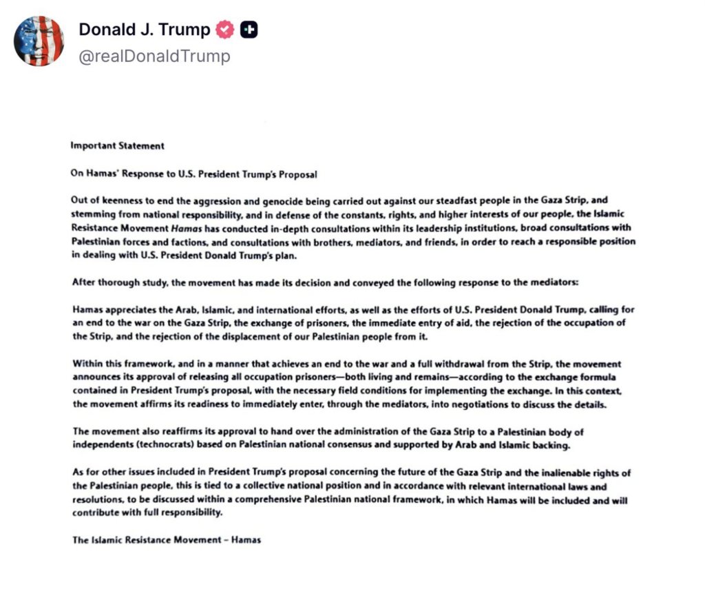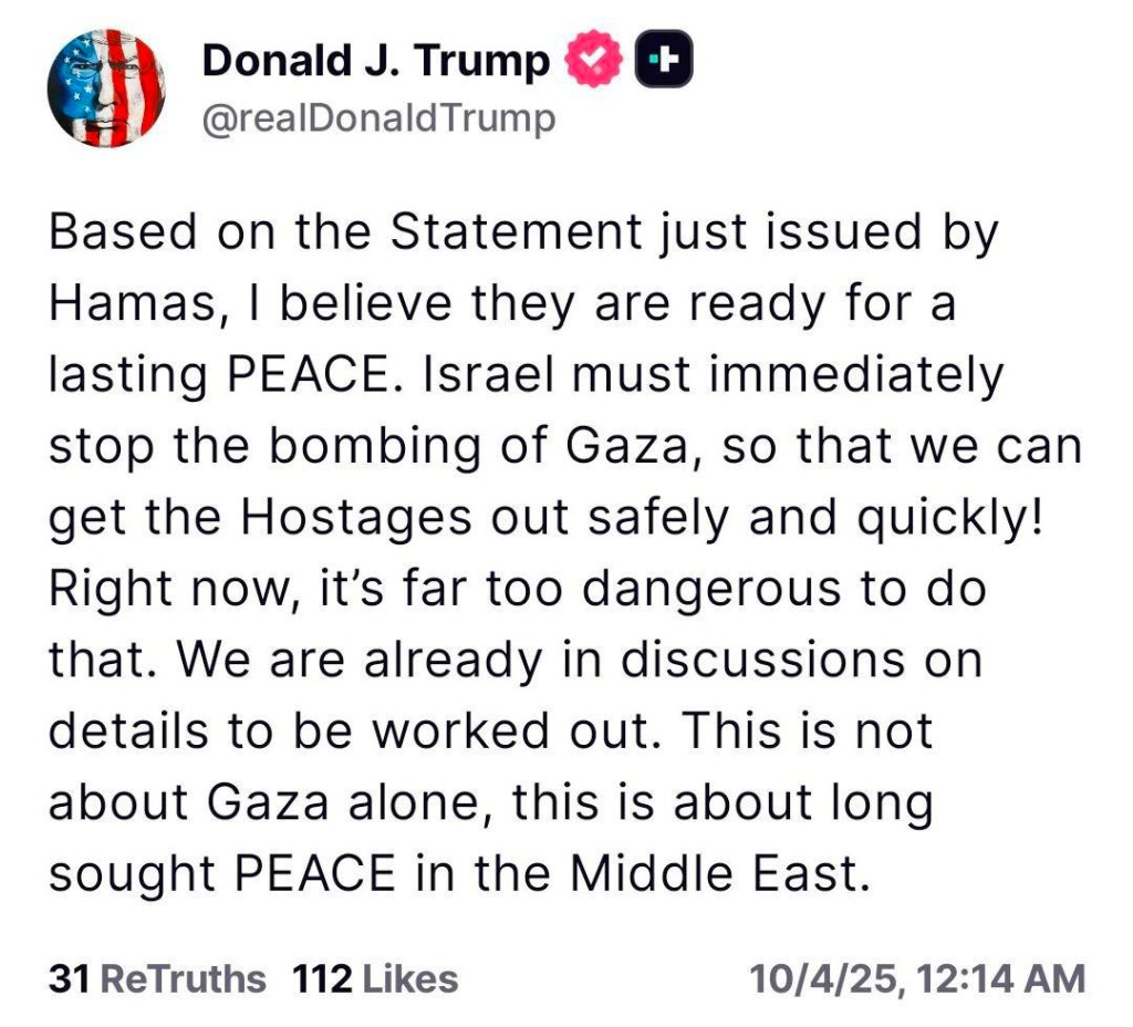 TRUMP SAYS HAMAS IS READY FOR PEACE & CALLS ON ISRAEL TO STOP BOMBING GAZA NOW