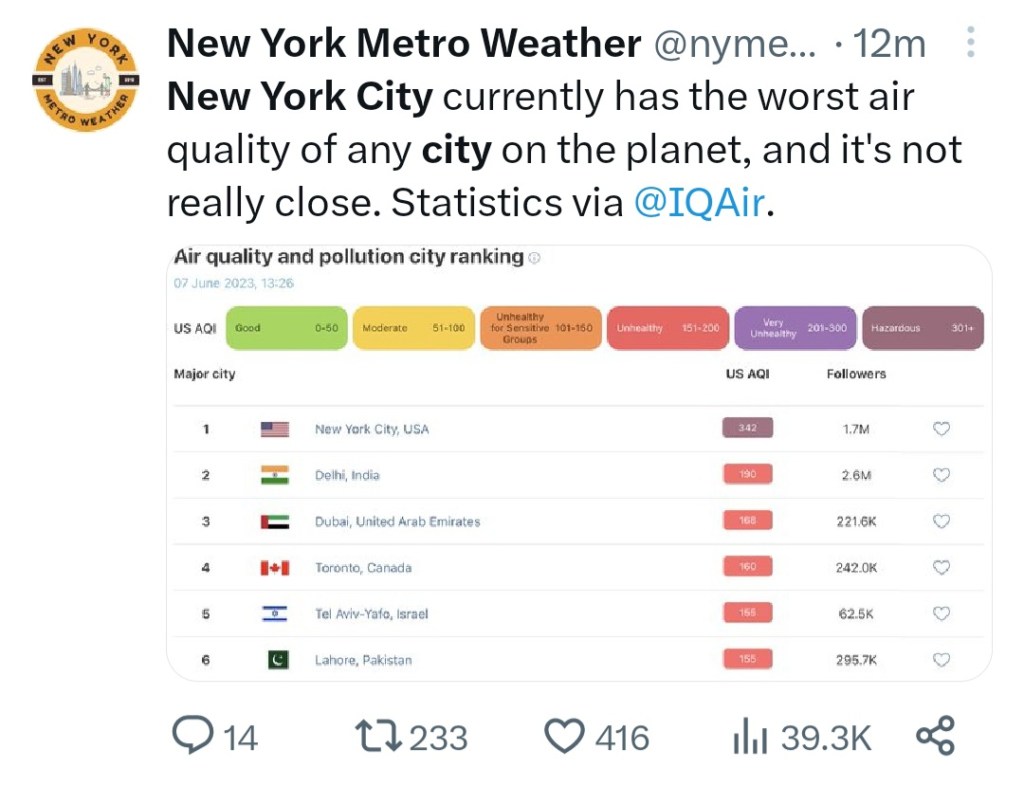 😀 NEW YORK CURRENTLY RANKED AS HAVING THE WORST AIR QUALITY ON THE PLANET – TOXIC SMOKE FROM CANADA’S WILDFIRES CREATING CONDITIONS RESEMBLING DOOMSDAY 🌬 πŸ‡ΊπŸ‡Έ