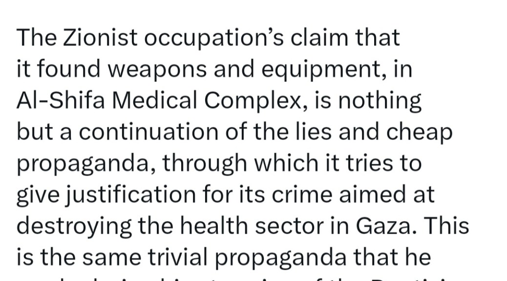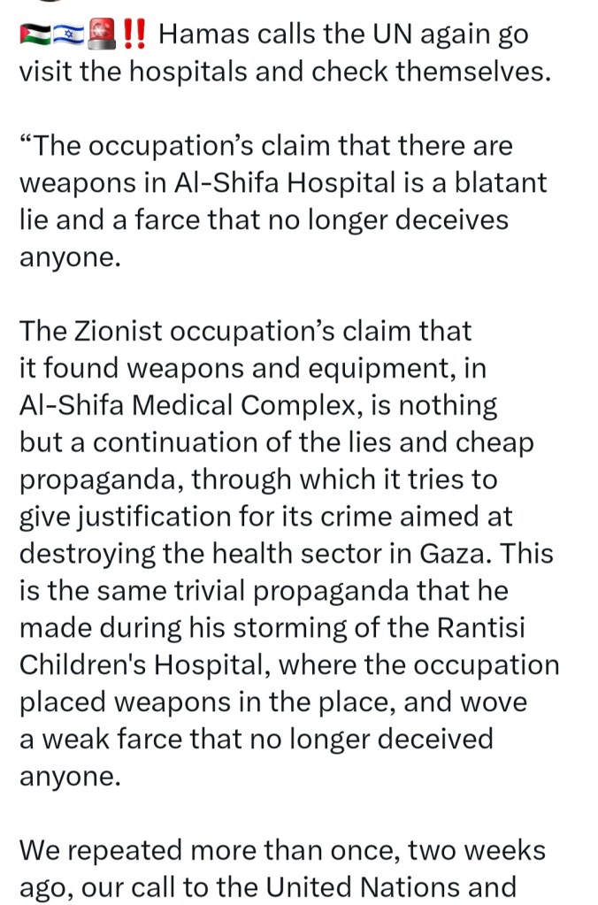 πŸ₯ HAMAS CALLS ON THE UN – AGAIN – TO CHECK ISRAEL’S CLAIMS ABOUT GAZA HOSPITALS, FOLLOWING THE ISRAELI ARMY’S COWARDLY RAID ON AL SHIFA HOSPITAL 🏨