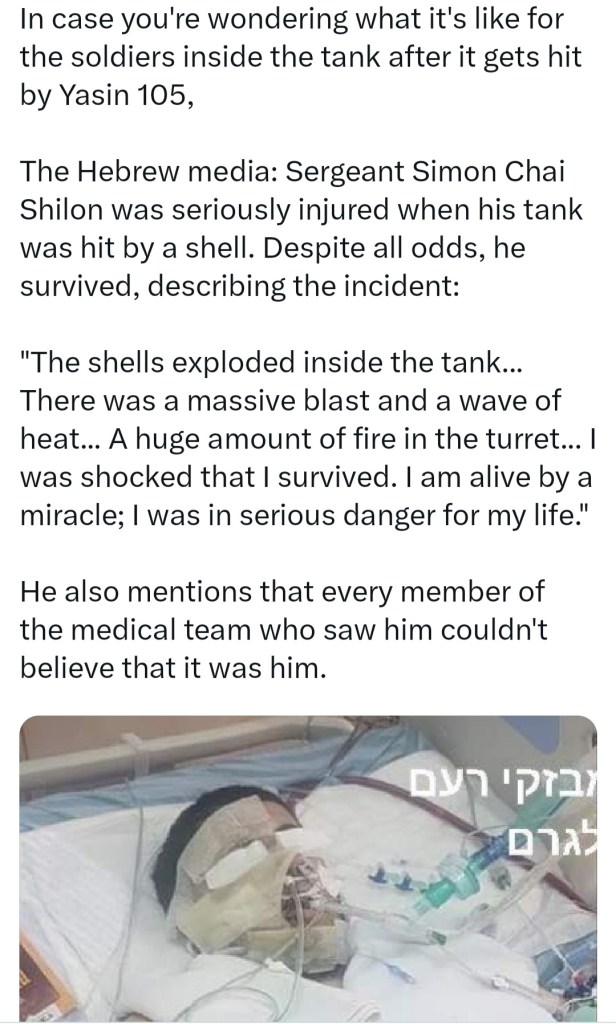 🚁 ‘THE SHELL(S) EXPLODED IN THE TANK.. THERE WAS A MASSIVE BLAST AND A WAVE OF HEAT.. I AM ALIVE BY MIRACLE’.. ISRAELI SOLDIER DESCRIBES THE MOMENT HIS TANK WAS HIT BY A YASIN 105 ⚠️ 💀 ☠️ ✋️