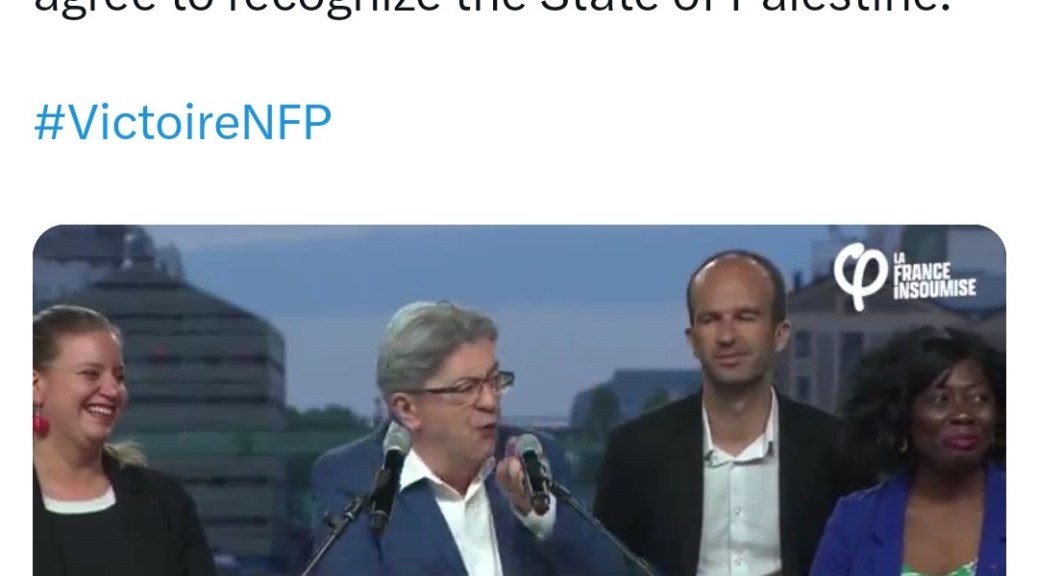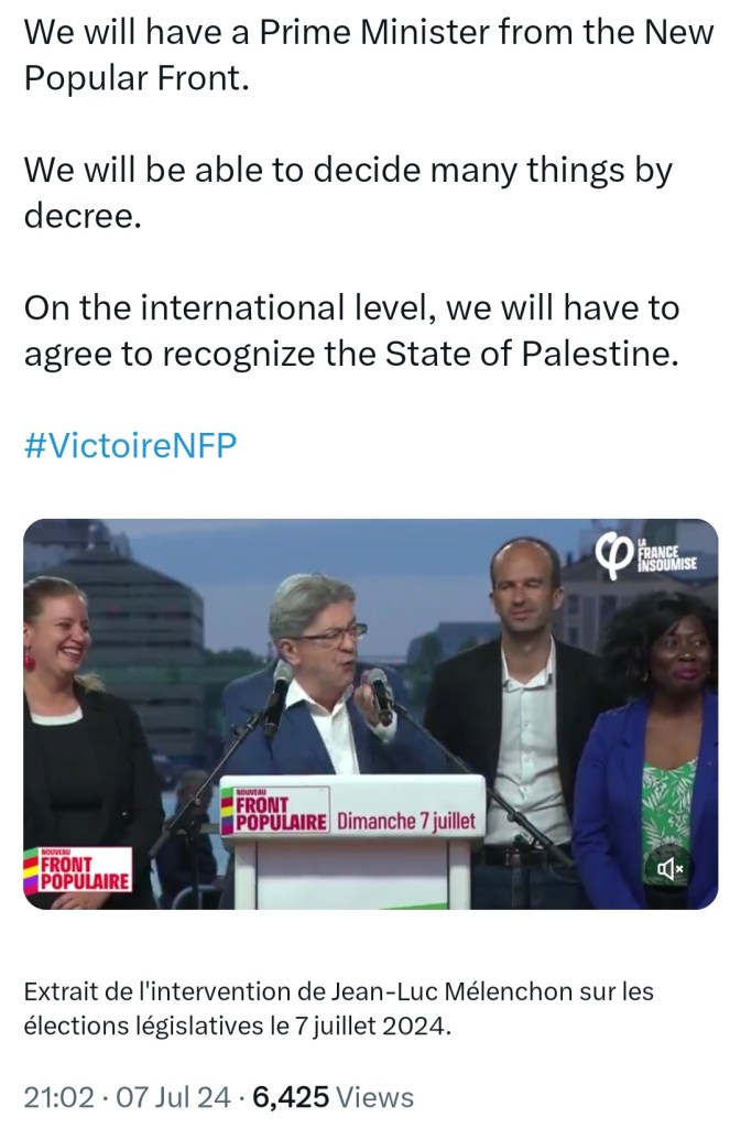 πŸ—³ FRANCE’S LEADER OF LEFT WING ALLIANCE PROMISES TO RECOGNISE PALESTINIAN STATE  β˜‘οΈ πŸ‡«πŸ‡·