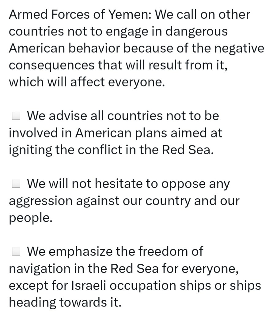 πŸ”₯ DAY 86 πŸ”₯ YEMEN’S STATEMENT AHEAD OF PROBABLE WAR WITH US IN THE RED SEA .. NAVIGATION FOR ALL EXCEPT OCCUPYING ISRAELI SHIPS🚒 βš“οΈ πŸ‡ΎπŸ‡ͺ ✌️ πŸ‡΅πŸ‡Έ